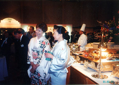 女子プロゴルフ協会35周年パーティーにて。 和服姿の日陰プロ(左)、元協会事務局員(右) |