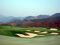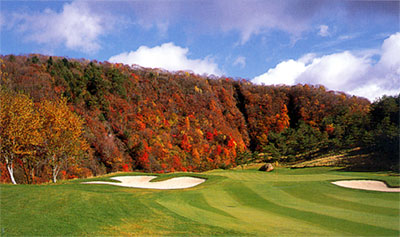 新緑も素晴らしいが、空の青さと併せて色鮮やかな紅葉の時季がボナリで最も美しいのではないかと思う。ゴルファーはどんな素敵な景色より自分のボールを追いかけてしまうものだが、ここの2番ホールだけは景色が一番、ゴルフが二番となること間違いなしだ。 数々の美しいホールの中でも、グリーンの奥に紅葉の屏風が立てかけられているような光景のこのホールが私は大好きである。 今回はまだ色づいていなかったので残念だったが、本来紅葉すればこんな景色となるということで写真はあえて同じアングルで2枚掲載した。