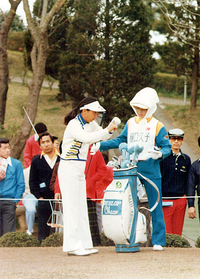 バッグとのカラーコーディネイト 1979年ワールドレディスでの樋口久子プロ(現LPGA会長) |