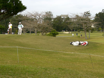 グリーンに着いたら、キャディはバッグをグリーン脇に置きに行きます。その時に立てておいたバッグが風で倒れると…、ということを想定してキャディバッグは寝かしておくことが基本ですが、それでも風でコロッと転がってしまう場合があります。