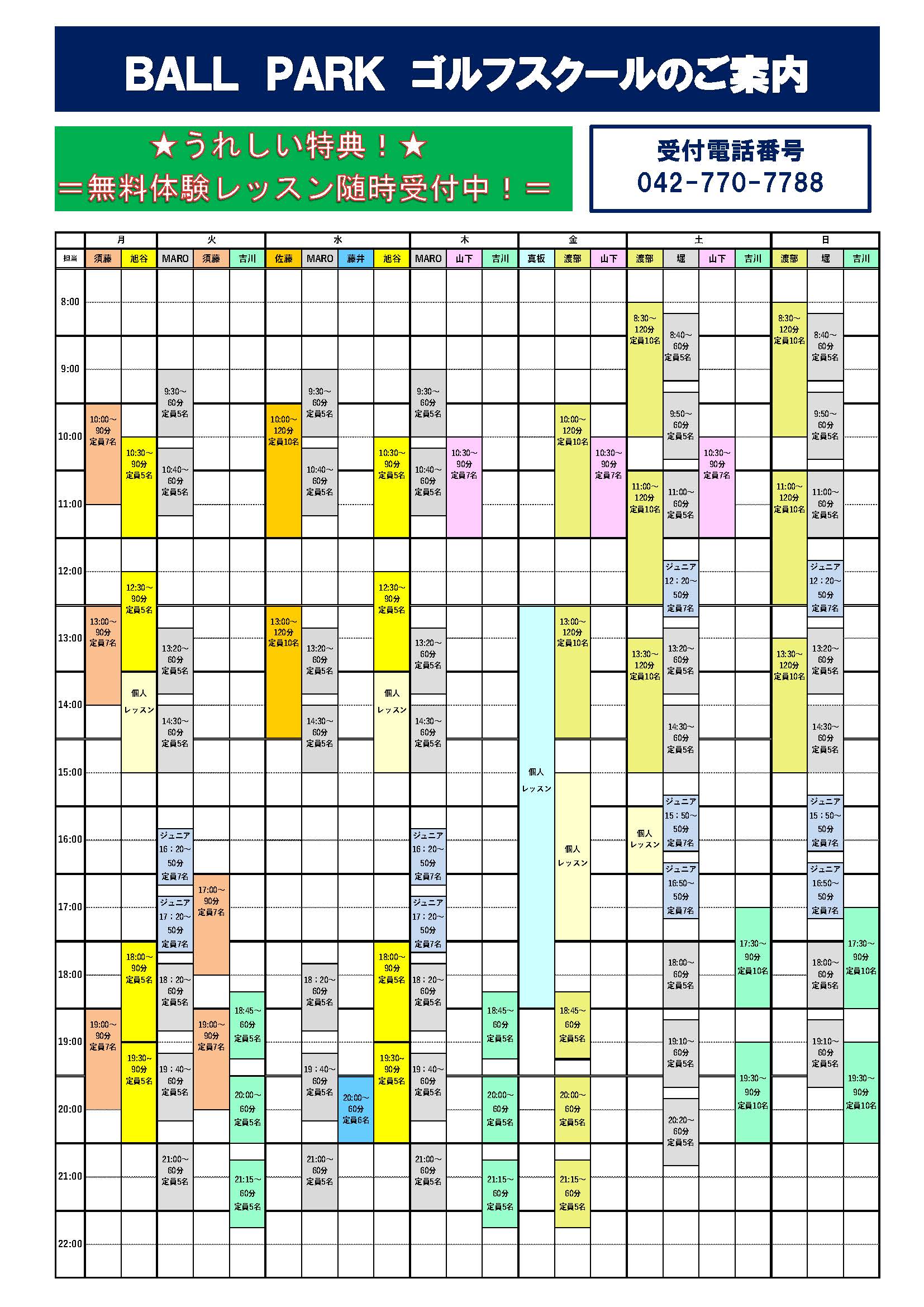=STAFF= ◇渡部正美 日本プロゴルフ協会会員 ◇佐藤龍 日本プロゴルフ協会会員 ◇吉川大助 日本プロゴルフ協会会員 ◇山下七枝 日本女子プロゴルフ協会会員◇堀貴麿 日本プロゴルフ協会会員◇名倉康太 JGTO会員◇須藤寛幸 日本プロゴルフ協会会員◇藤井誠 日本プロゴルフ協会会員◇旭谷智行 日本プロゴルフ協会会員◇真板潔 日本プロゴルフ協会会員